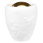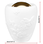 This delicate Butterflies Ceramic Cremation Urn is one of our handmade art urns. The outside of the ceramic urn is decorated with finely detailed butterflies. A butterfly’s life is short, but they bring joy wherever they appear. Their outstanding beauty always brings a smile to people’s faces for the short time that they are with us.Our Butterflies Ceramic Cremation Urn is a unique cremation urn. The beautiful, pure white ceramic design is beautifully complemented by the gold-plated cover. This ceramic urn for ashes would make a wonderful memorial to someone whose beauty and grace was taken from us too soon.