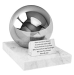 Stainless steel cremation urn in the shape of a ball. A durable combination of a marble base and a stainless steel sphere where the ashes are placed.