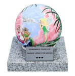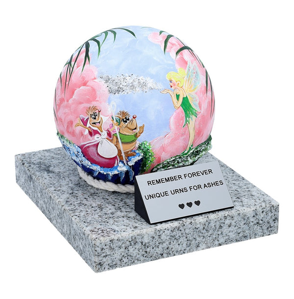 The urn features a hand-painted stainless steel sphere, adorned with a magical fairy motif, symbolizing innocence, wonder, and eternal light. Resting on a solid stone base, it combines elegance with lasting durability. The base also includes a customizable memorial plaque, where a name, dates, or a heartfelt message can be engraved, making this urn a truly personal keepsake.