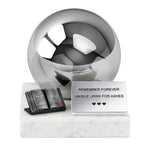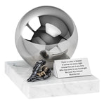 Stainless steel cremation urn in the shape of a ball. A durable combination of a marble base and a stainless steel sphere where the ashes are placed.