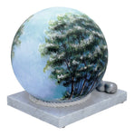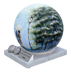 Stainless steel cremation urn in the shape of a ball. A durable combination of a marble base and a stainless steel sphere where the ashes are placed.