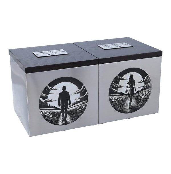 Each urn features a unique engraved scene on the front – one depicting a man and the other a woman, both walking peacefully through a serene landscape toward the horizon. These images represent eternal love, unity, and the shared journey of life, even beyond.