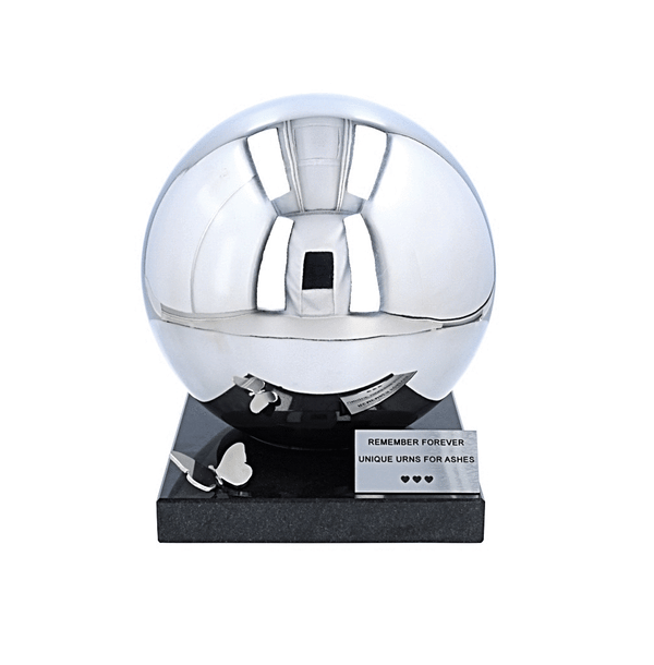 Stainless steel cremation urn in the shape of a ball. A durable combination of a marble base and a stainless steel sphere where the ashes are placed.