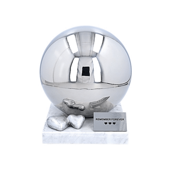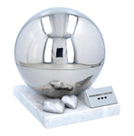 Stainless steel cremation urn in the shape of a ball. A durable combination of a marble base and a stainless steel sphere where the ashes are placed.