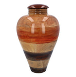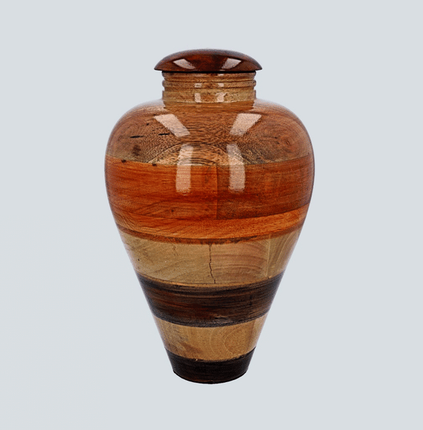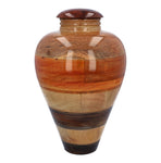 Discounted Medium-Sized Urn: Our exquisite mango urn is a perfect choice for those seeking a beautiful cremation urn for their loved one's ashes. The urn is entirely crafted from mango wood and features a unique segmented texture. This wooden urn is a wonderful way to honor the memory of your loved one who enjoyed nature or preferred simplicity.