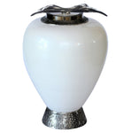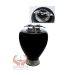 This elegant cremation urn is made in a unique way, and it is one of the most beautiful ones in our range of funeral urns. Made from thick black glass, this urn is a piece of art, which is certainly appropriate for your loved one’s ashes lying in it. This urn is a cremation urn for adult as it is a large urn, measuring 20cm by 28cm. it has an intricately designed silver coloured base and top, and on the very top part there are white pearls which make it look even more elaborate and elegant.