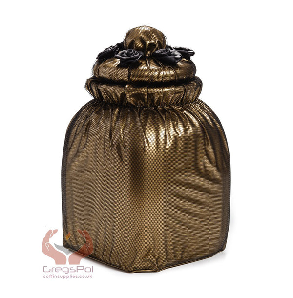 Our funeral cremation urns are all handmade with a great deal of attention and artistic dedication. This is yet another beautifully designed cremation urn for ashes from our collection. Made from glass and trimmed with fabric material , this is an elegant and very formal funeral urn for adult. There is also a pattern of small fabric roses on the top. This is a very artistic and creative funeral urn that will be an ideal resting place for the ashes of your beloved relative.