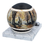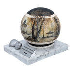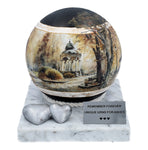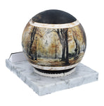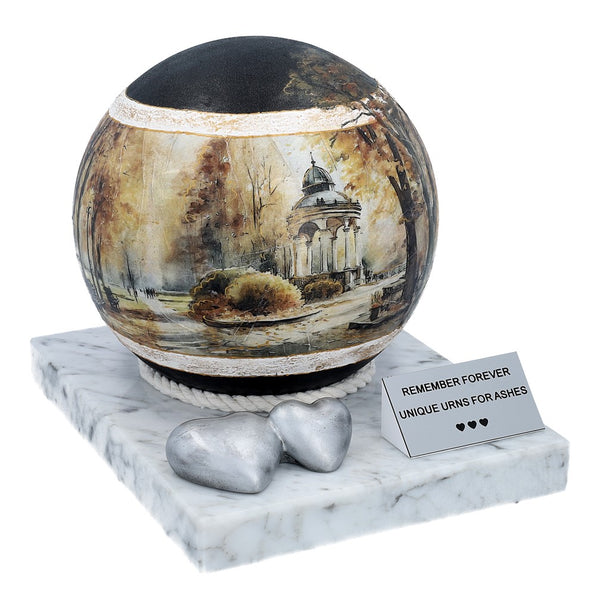 Autumn is a time of reflection, change and beautiful, nostalgic memories. This artistic cremation urn with an autumn theme has been created to commemorate a loved one in a way that is full of deep symbolism and natural beauty.The urn consists of a stainless steel sphere depicting an autumnal landscape - park avenues, benches and golden leaves that symbolise peace, warm memories and an enduring bond. The sphere rests on a marble base, adding elegance and durability. A double heart figurine is placed on the base as a sign of eternal love and remembrance, as well as an engraved plaque on which a name, dates or a personal dedication can be placed.The ashes are placed in the urn from underneath, through a discreet screw-on closure that ensures security and durability.