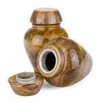 Keepsake urns are generally smaller vessels that hold a portion of the cremated remains, and are used by family members who would like to keep a small amount of remains when sharing or burying.