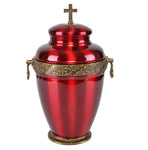 This funeral urn is a wonderful Red colour and it is tastefully decorated with an intricate golden rose on the top or cross.