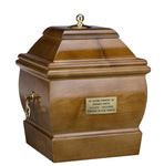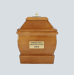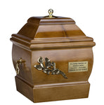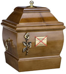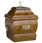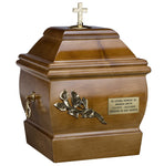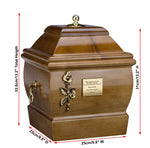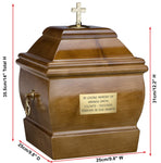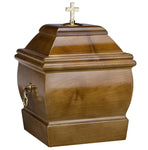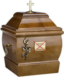 A beautiful work of art that inspires a sense of repose with its elegant style. Made from solid wood, this is a beautiful casket shaped urn for funeral ashes to be kept safe and stored with dignity. You want the final resting place of your loved one to be as beautiful as possible, and this elegantly designed cremation urn is certainly a good choice. In fact wooden urns for ashes are among the most sought after kinds of urns as they are stylish, well-designed and ideal when it comes to having the urn blend nicely in the room where it is placed. The casket shape is elaborately finished with a cross and handles in gold. This urn is handmade and nicely finished, and since it is rather large it is an ideal urn for ashes for adults. For other similar wooden cremation urns or other styles made from other materials, make sure to browse through the vast selection available on our website or contact us for more information.