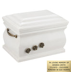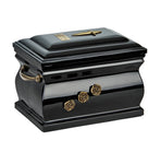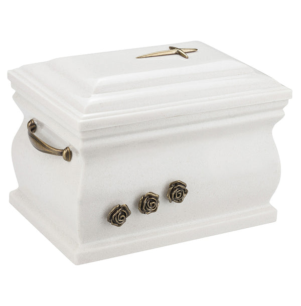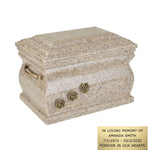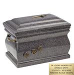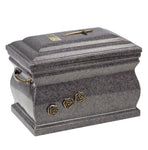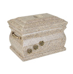 Our granite casket to preserve cremains is well designed. It has a sturdy body with handles. Its surface has a smooth and satin feel. The craftsmen invest a lot of time and effort to create something like this out of the natural stones and minerals. Additionally, there are some other features that make the urn looking appealing. There are roses carved beautifully on it. They too are made of brass and compliment the grey color of the cremation urn. This casket also has a cross on the top making a good form to keep memories of your beloved ones. The opening lid is placed at top of the urn.