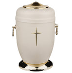 Metal has become a very popular material for cremation urns. Its sleek and polished look appeals to many, not to mention the fact that it is durable and resistant, and you would want this aspect in a cremation urn. However this metal cremation urn for ashes is not just a metal urn, but rather it is a work of art. Designed in a very delicate manner to portray one’s feelings in an exquisite manner, this cremation urn comes in a creamy colour, and one may choose whether to have a rose or a cross to adorn it on the front. Both options are very nice embellishments in gold, designed in a very delicate way. The base, handles and top part of the urn are also in gold. The contrast between the creamy colour and gold is very nice and this cremation urn will surely be the centre of attention wherever you place it so as to help you remember your loved one’s memories. This particular design is ideal for anyone, so they are popular as urns for ashes for adults.