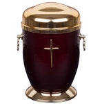 The Burgundy Red Metal Cremation Urns is a wine red urn for ashes highlighted with gold Cross and handles. The red color is often associated with love and might pay tribute to a grand love. This classic Urn style and Shape combined with burgundy color could also remind the family person with flair and style. Several families have been grateful to find our beautiful red metal cremation urn for ashes on a memorial urn to express their feelings. Strong metal construction by our talented artist, guarantees secure containment of the ashes of an adult prior to cremation. Our burgundy metal Cremation Urn closes with lid on top of the Urn.