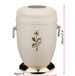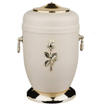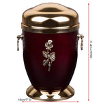 This funeral urn is a wonderful Burgundy Wine colour and it is tastefully decorated with an intricate golden rose emblem on the front. Handcrafted by artists, our steel cremation urn for ashes with gold rose has delicate gold handles on each side and a highly polished gold top. The ashes casket is 30cm high, has a diameter of 19cm, and the urn for ashes opens from the top.