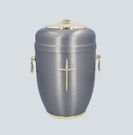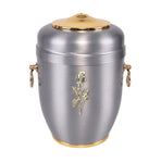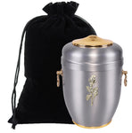 Made of solid metal, the silver Metal Cremation Urn with the Gold cross is a sturdy and suitable option for burial or display. The finish is silver and a small piece of the cross placed in a mosaic pattern. Our metal cremation urns are a traditional option, yet newer styles allow families to find an urn that expresses their loved one's unique style or color preference or interests. Our Metal Cremation Urns are usually designed according to the traditional styles and design of the ancient cultures and it is these timeless styles, along with long lasting durability that provides Metal urns a sole connection with eternity , and one may choose from two designs where there is either a golden rose or a golden cross embellished in the middle.