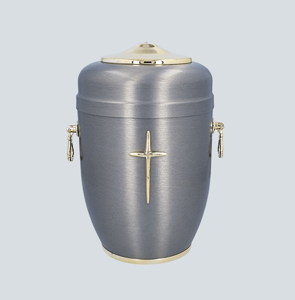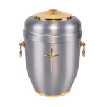 A gold cross in a beautiful style stands out against the silver back ground of the elegant Silver metal cremation urn with a gold cross. Families are comforted in selecting our gorgeous Metal Cremation Urn with the elegant gold cross as a symbol of faith. Few people have shared that the pearly Gold cross on this gorgeous Urn reminds them of purity and heaven. Our Metal Cremation Urn provides a remarkable display of a loved one’s ashes whether shown funeral kept at home or placed in a niche at church columbarium.