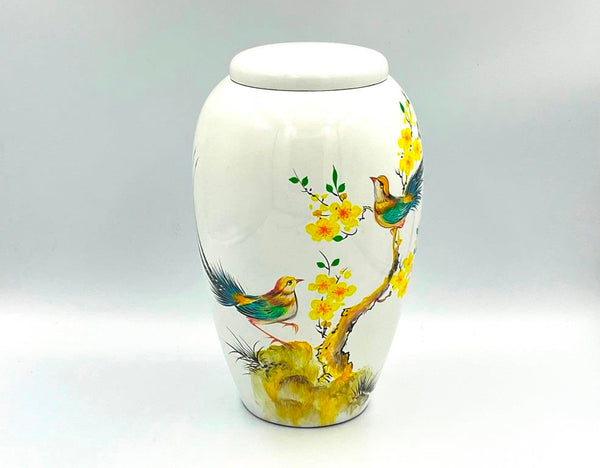 Discover an exclusive cremation urn adorned with painted birds. This unique urn is a true masterpiece, carefully crafted to create a captivating and eye-catching display.
