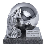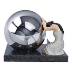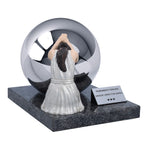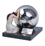 A figure of a grieving woman leans over the sphere, her head bowed and hands resting sorrowfully upon it, embodying the profound emotions of loss and mourning. The sculpture captures a moment of deep introspection, as though she is weeping over a grave, conveying empathy, solace, and a sense of shared human vulnerability. At the bottom of the granite base, a discreet, threaded opening allows for secure closure, ensuring the ashes are preserved with dignity and care.