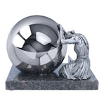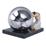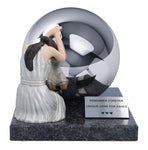 The "Grief" urn is a unique, deeply symbolic cremation urn designed for those seeking an artistic expression of sorrow and remembrance. The urn takes the form of a polished stainless-steel sphere, elegantly mounted on a granite base, which adds weight and stability to the piece. The reflective surface of the sphere mirrors the environment, creating an effect of infinite depth, symbolizing the timeless bond and enduring memory of a loved one.