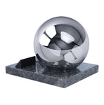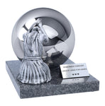Stainless steel cremation urn in the shape of a ball. A durable combination of a marble base and a stainless steel sphere where the ashes are placed.