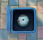 Stainless steel cremation urn in the shape of a ball. A durable combination of a marble base and a stainless steel sphere where the ashes are placed.