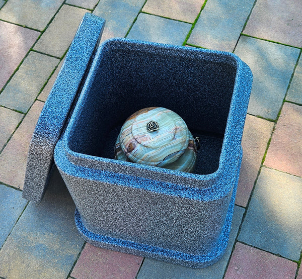 A container made of ABS plastic designed for burying the urn in the ground or in a tomb. The container is weather-resistant and does not degrade in the soil.