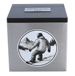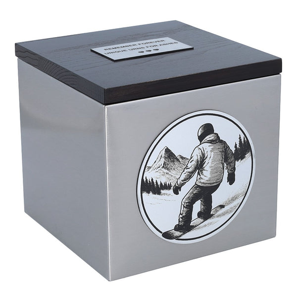 This unique urn is a tribute to those who loved freedom, adventure and the snowy slopes. Made from matt stainless steel with a contrasting wooden lid, it provides a modern yet classy resting place for a loved one.The front of the urn features a precise engraving of a snowboarder riding down a mountain slope, making it an ideal choice for snowboard and mountain lovers.