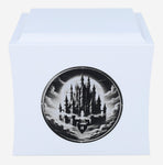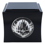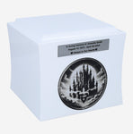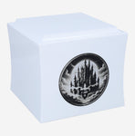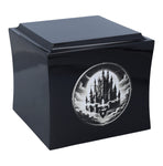 The urn has a classic box shape and is available in black or white. Its gently rounded edges give an elegant and modern look. The front features an engraved graphic of a castle floating in the clouds - a motif that symbolises peace, dreams and passage to another, better world.