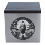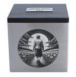 The interior of the urn is lined with soft felt to protect the ashes of the deceased in a dignified and gentle manner.On the front is a subtle black and white engraving depicting an elderly woman walking along a path among flowers, towards the setting sun - a symbol of the end of life's journey and the transition to eternal rest.