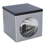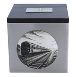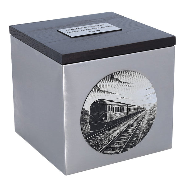 An elegant cremation urn with a train motif for railway enthusiasts, train drivers and railwaymen. The brushed stainless steel body combines with the dark wooden lid to create a modern and timeless design. The front features a circular, finely engraved graphic of a train - a symbol of travel and constant journey. An optional plaque with your own text in memory of a loved one can be placed on the lid. The urn has a full-size capacity suitable for an adult and is suitable for display in a home or columbarium or memorial.