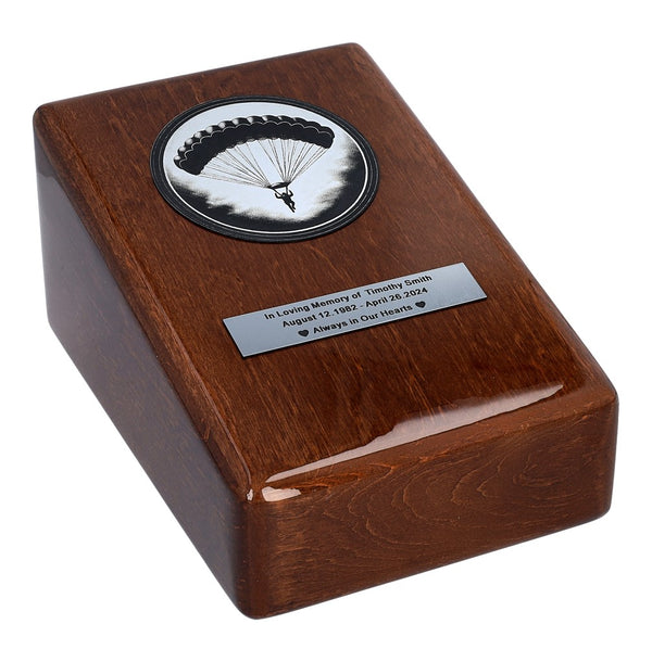 Losing a loved one is never easy, but the way we honor their memory can reflect their spirit and life’s passion. This wooden cremation urn for a paratrooper is a unique way to pay tribute to someone who loved freedom, adventure, and the sky.