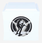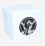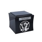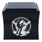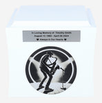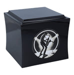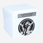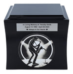 The urn has a classic boxy shape with gently rounded edges, available in elegant black or white. It features a saxophone player finely engraved on its front, symbolising the love of music and rhythm that still resonates in the hearts of loved ones.