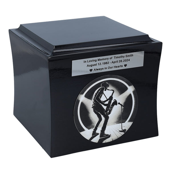 Music is more than just sounds - it's emotions, memories and a part of the soul that never goes quiet. If your loved one loved playing the saxophone, this cremation urn with a saxophone player motif is a unique way to honour their life and passion.
