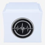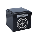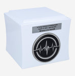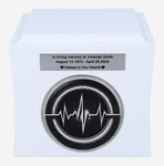 The urn has a classic box shape with slightly rounded edges and is available in elegant black or white. The front features an engraved diagram of a heartbeat, which symbolises human life - with its highs, moments of joy and emotion. Just above the graphic is a personalised plaque on which you can write your name, dates or a personal message. This is a beautiful and touching way to honour a loved one.