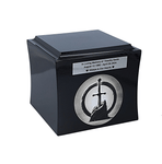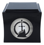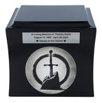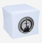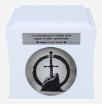The urn has a classic box shape with slightly rounded edges and is available in black or white. The front features an engraved graphic depicting the legendary sword driven into a rock - a symbol of steadfastness and strength of spirit. Just above the graphic is a personalised plaque on which you can place a name, dates or a personal message.