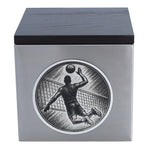 An elegant cremation urn for the player or volleyball enthusiast. The body is made of high-quality stainless steel and the lid is made of dark wood, which gives the whole a modern and noble character.