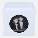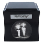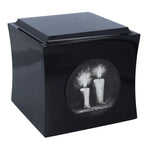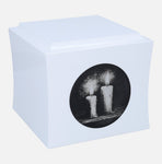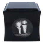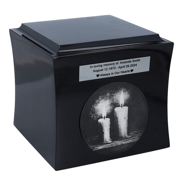 If you are looking for a unique way to honour the memory of a loved one, this wooden urn with engraved candles will be a beautiful and symbolic choice. For centuries, the flame of a candle has been recognised as a sign of remembrance, life and spiritual light - illuminating the darkness, bringing peace and hope.The urn has an elegant, boxy shape with gently rounded edges, and is available in black or white - two classic colours to suit any memorial arrangement. The front features an engraving with a motif of burning candles that diffuse the darkness to create a moving and emotional image. Above the graphic is an engraved plaque where you can add a name, dates or a short dedication - something that comes straight from the heart.The ashes are poured in from the underside, through a removable screw-on lid for discreet and secure storage.