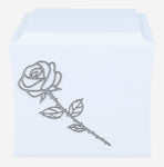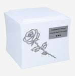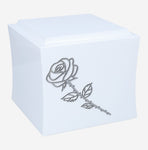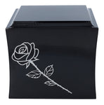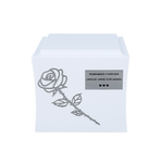 Honor the memory of a loved one with this Wooden Urn with Rose, a beautifully crafted tribute symbolizing love, remembrance, and eternal beauty. Made from high-quality solid wood, this box-shaped urn with gently rounded edges offers a refined and timeless resting place. The front is adorned with a delicate silver rose, representing love that never fades, alongside a customizable memorial plaque, where a name, dates, or personal message can be engraved to create a truly unique keepsake.