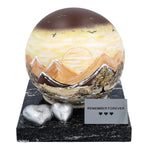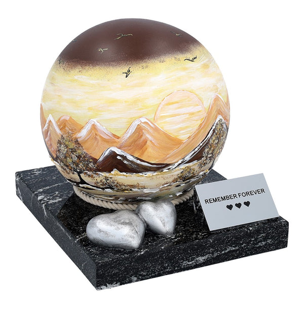The urn consists of a hand-painted stainless steel sphere decorated with a sunset motif - symbolising serenity, reflection and eternal rest. The sphere rests on a solid stone base, which lends stability and elegance to the whole. A double heart figurine is placed on the base, symbolising undying love and a bond that never fades.