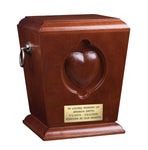This cremation urn features a solid wood casket with a finely hand-carved heart on the front panel or a cross, adding a touch of artistry to its design. The handmade construction ensures a unique and dignified final resting place for cremated remains.