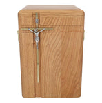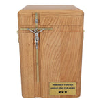 Cremation urns with a traditional design have always been popular choices. Many like to stick to a design that is formal and elegant, and this beautifully designed cremation urn for ashes in the shape of a casket is certainly a nice choice. Made from solid wood, and with a cross on the front panel, and handles on the sides, this handmade cremation urn for ashes is an artistic and unique resting place for your loved one.