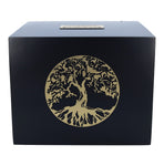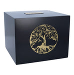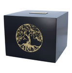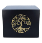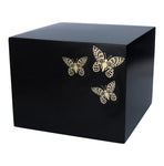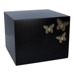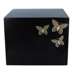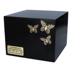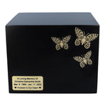 Black wooden cremation urn, shaped like an elegant box and adorned with three delicate butterflies, symbolizing transformation and beauty. This urn is a poignant tribute to a cherished adult. The personalized engraved memorial plaque adds a touch of sentimentality, allowing you to immortalize your loved one with a heartfelt message.