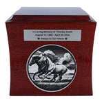 This urn features an intricately engraved image of horses on the front, capturing the beauty and spirit of these majestic animals. The slightly rounded edges of the box add a touch of modern elegance. Additionally, a personalized memorial plaque on the front allows for custom text, such as the name, important dates, or a personal message, making this urn a unique and heartfelt tribute.