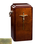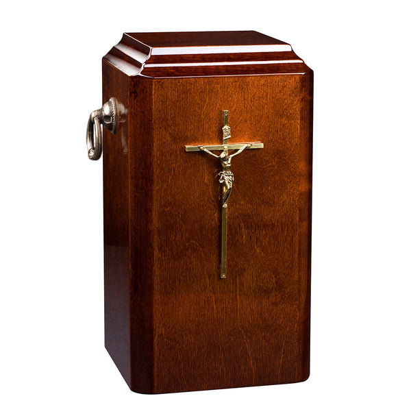 This simple but elegant and unique urn for ashes is one of our modern cremation urns. It is an ashes funeral casket crafted by hand from real wood. The funeral urn is available without a decoration on the front, or there is a choice of a cross or a calla lily.