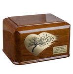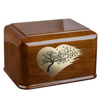 If you are interested in unique cremation urns that has a not so elaborate design, then this urn will probably be your choice. Made from solid oak wood, the urn is ideal for those who prefer a more contemporary design. The urn is handmade and on the front there is a tree with beards - ascension is the act of moving upwards, and these birds are symbolic of the soul rising up. The tree’s leaves and branches are moving in one direction as it seems to be windy. With a nostalgic and sad aura about it, this cremation urn is nicely designed and very inspirational.