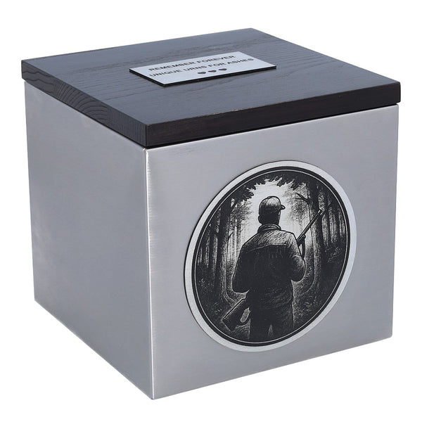 The cremation urn with a hunter motif is a unique choice for those with a connection to the forest and a passion for hunting. The body is made of brushed stainless steel and the lid is made of dark wood, giving the whole a modern and elegant look.