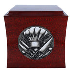 This urn features a polished mahogany finish, providing a timeless and dignified appearance. The slightly rounded edges add a touch of modern elegance. The front of the urn is adorned with an intricate engraving of kitchen utensils, symbolizing the love for cooking. Additionally, a personalized memorial plaque allows for custom text, such as the name of your loved one, important dates, or a heartfelt message, making this urn a unique and meaningful tribute.