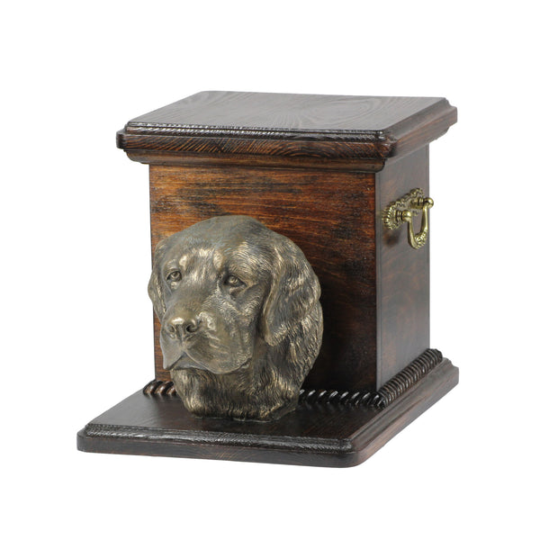 Beautiful wood casket cremation urn for dog’s ashes with standing statue Golden Lab