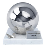 Stainless steel cremation urn in the shape of a ball. A durable combination of a marble base and a stainless steel sphere where the ashes are placed.